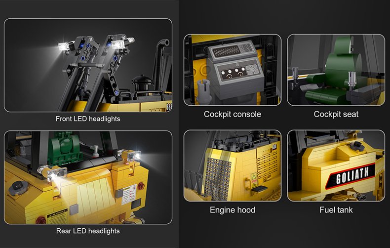 This exquisite building set features full driving capability, neutral steer, and fully functional shovel blade and ripper; including depth and angle control. This model also has functional lights and a realistic diesel motor mockup with moving pistons! Incredibly detailed inside and out- including the cockpit!