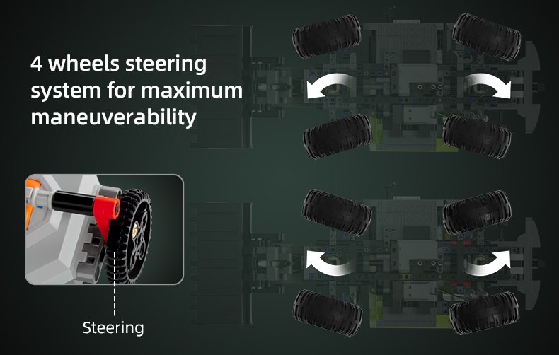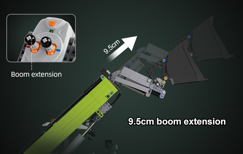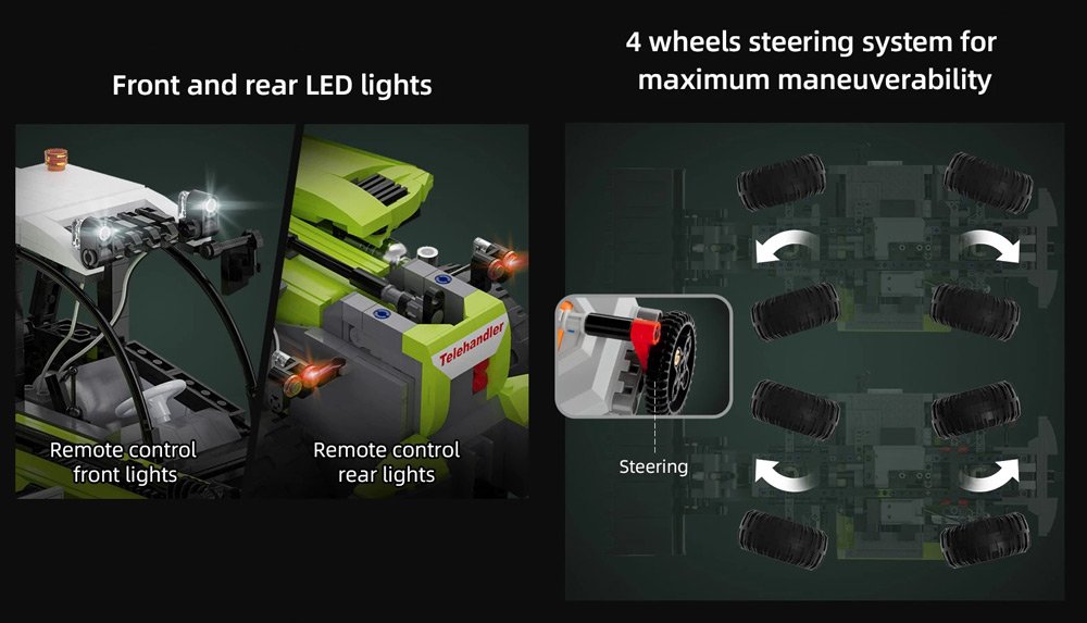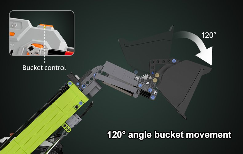 This set is sure to impress with working lights, fully operable arm that opens to 70 degrees, extends up to 9.5 cm, and a bucket rotation of up to 120 degrees. Full driving capabilities with 4-wheel steering for maximum maneuverability. Highly detailed interior and exterior. This set includes 1,469 pieces, CaDA’s power system, remote control, and full-color, high-quality, detailed instruction manual. Requires 4 AA batteries for the remote (not included)
