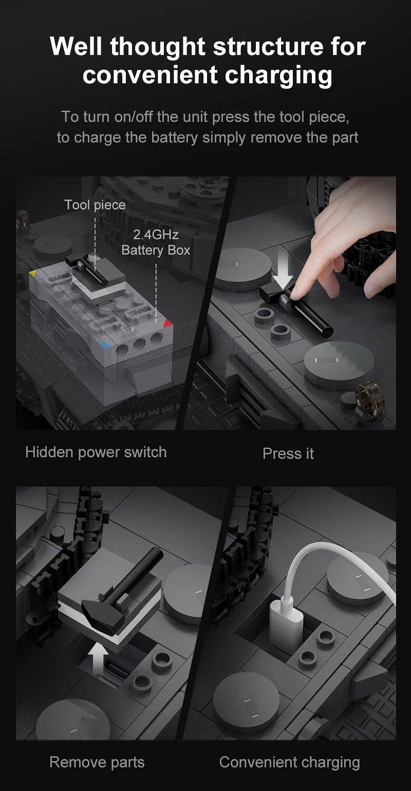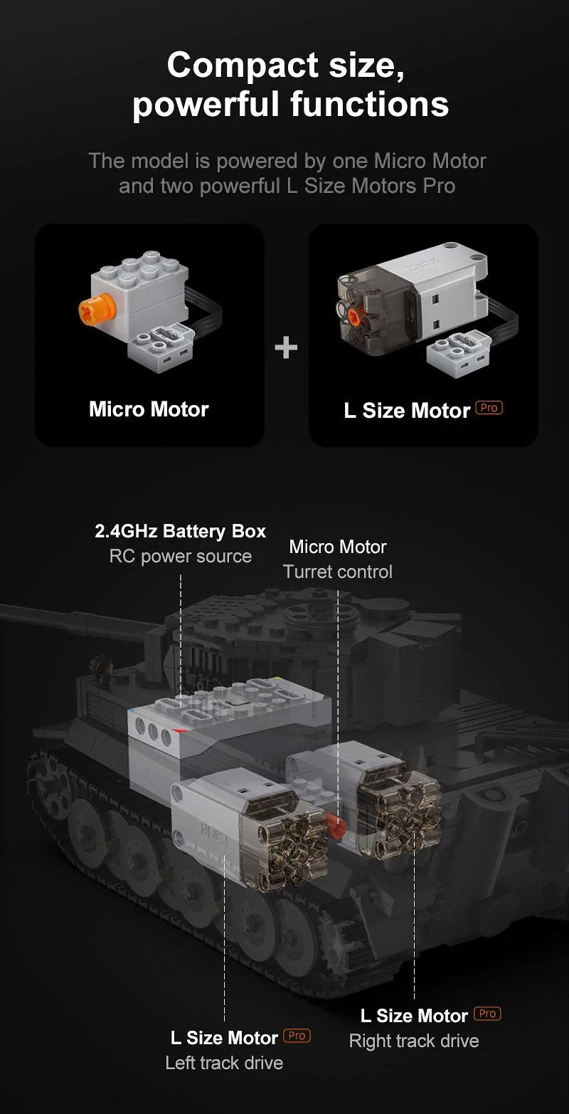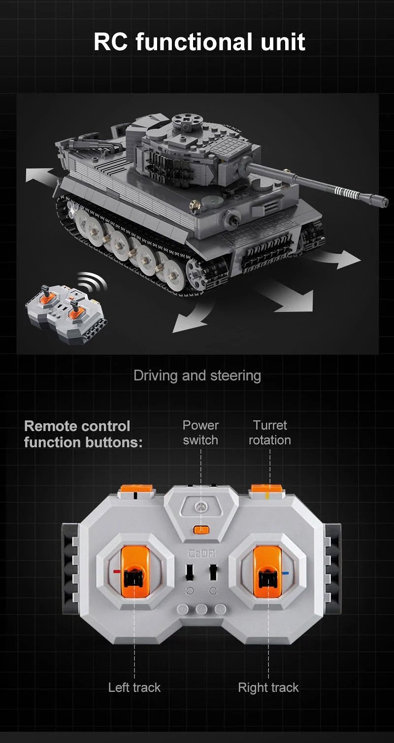 Bring your very own WWII German Tiger Tank to life with this incredibly detailed brick building set! This model features 360 degrees of turret rotation and up to 25 degrees of barrel elevation. The powerful CaDA power system makes for excellent driving capabilities, including one motor for each track as well as an additional motor for turret traverse.