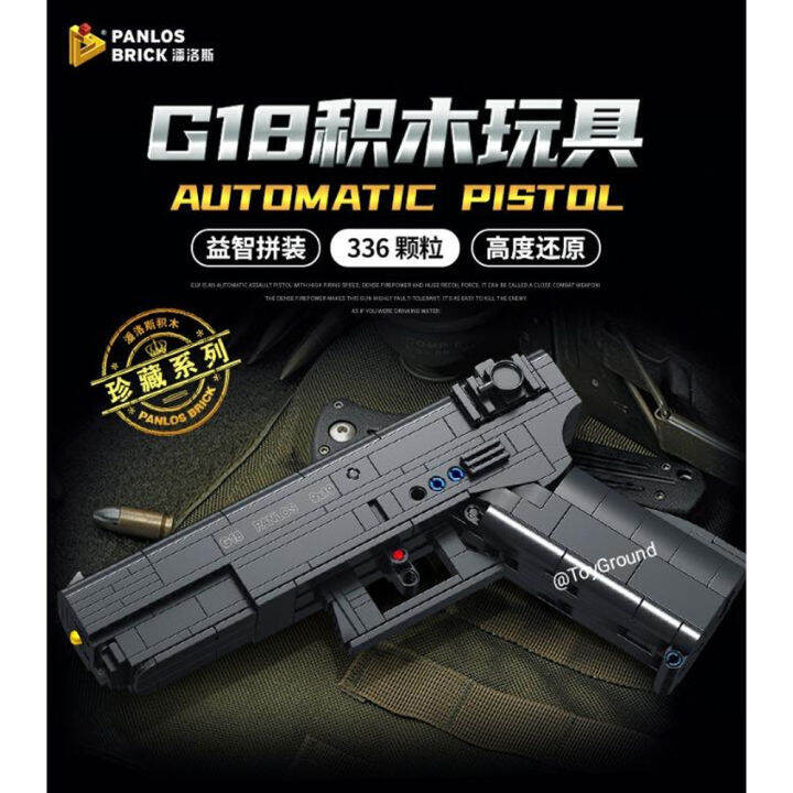 Display-Only Brick Model. Recreate the iconic G18 automatic pistol as a highly detailed brick display model. Precision paneling and scaled proportions make this an ideal shelf display or photography subject for collectors.