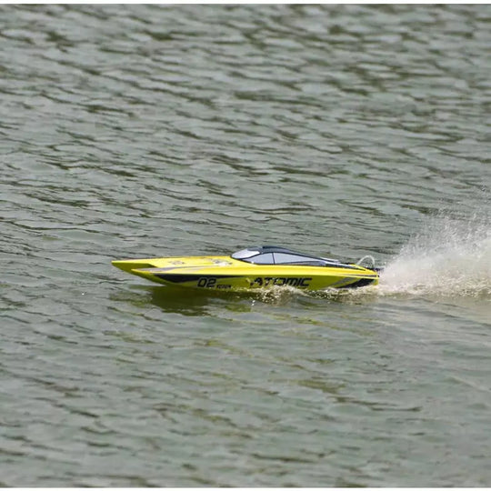 With a 2.4GHz radio control system, multiple boats can race at the same time without interference. Powered by an 11.1V 2200mAh LiPo battery, the ATOMIC provides up to 10 minutes of intense racing per charge.