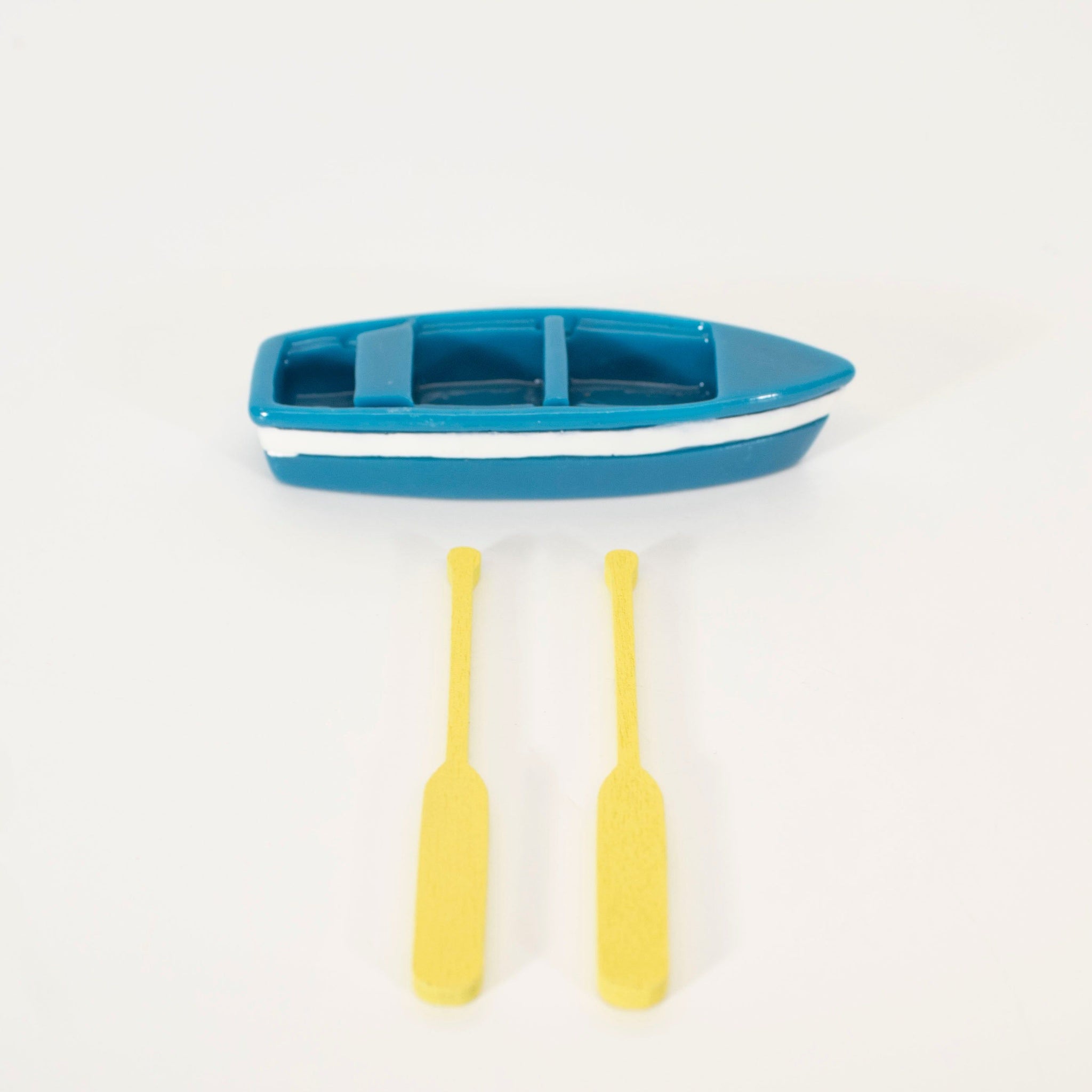 Blue and white Boat with Yellow oars, Boat measures 2.25"x0.48"x0.76". Oars measure 2.19"x0.23"x0.10".