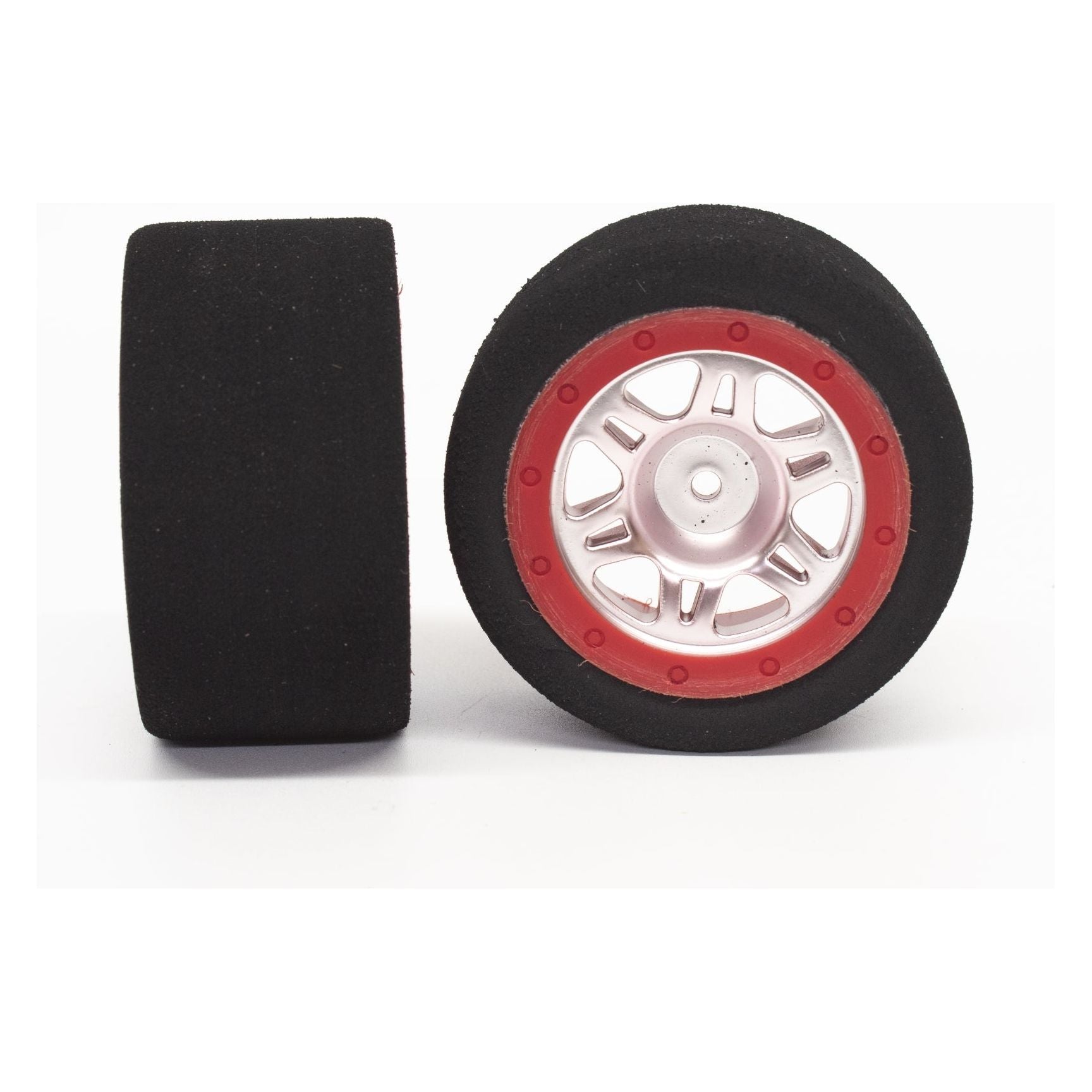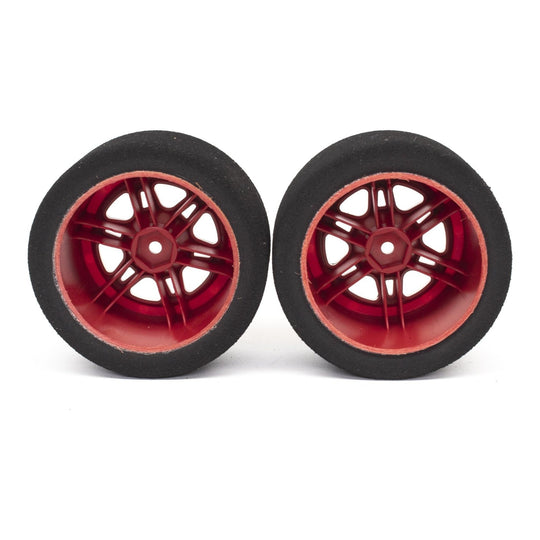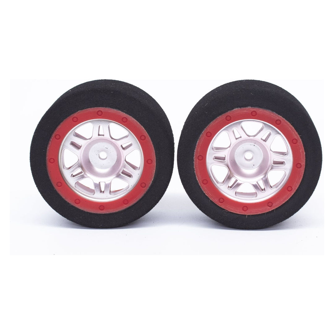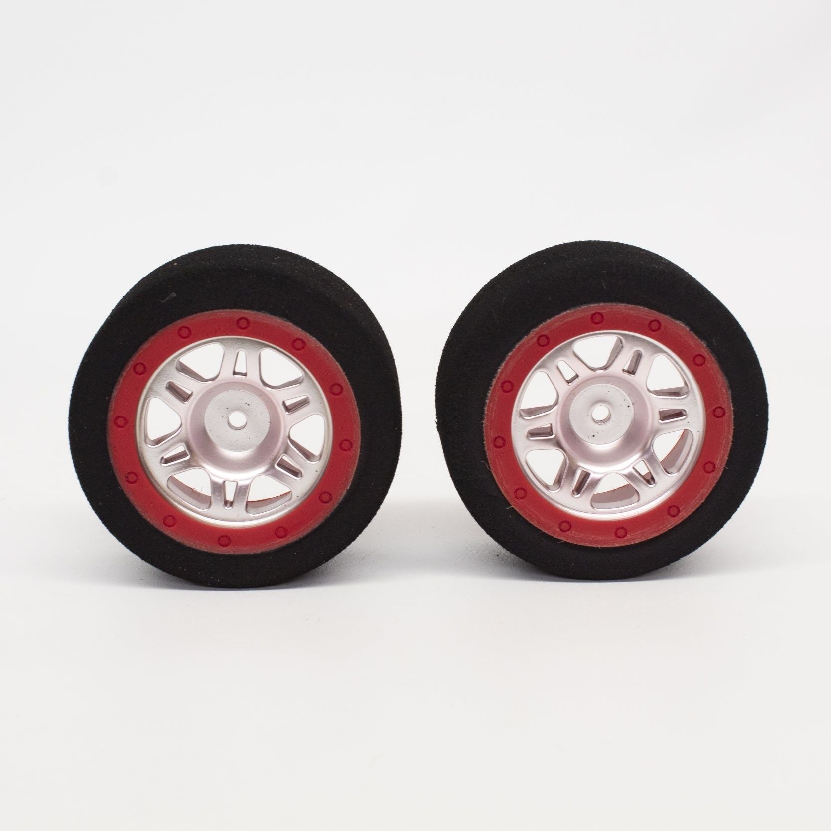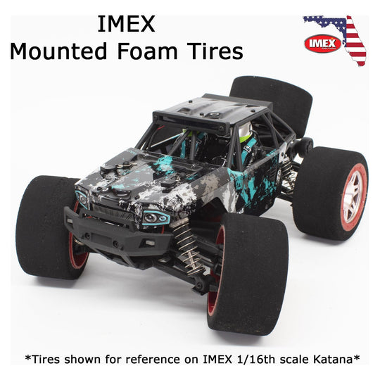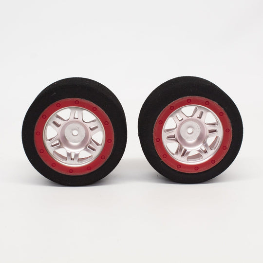 This listing is for a pair of our mounted foam tires for 1/16th scale or similar sized cars. These foam tires come mounted on a red faux beadlock rim with a silver rim. The hex size is 12mm.