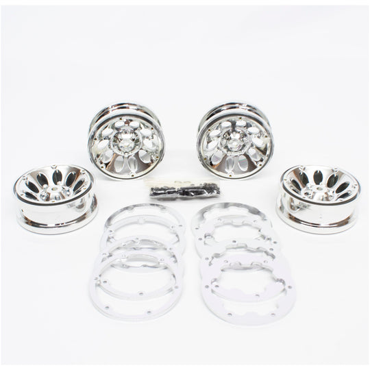 A set (x4) of 1.9" beadlock rims and beadlocks. These are true beadlocks on both front and rear and use a 12mm hex to mount. The rims are plastic while the beadlocks are metal. The screws are 1.5mm hex screws and use 6 screws per side (12 screws per total wheel) to attach. The screws are included with the wheel set.