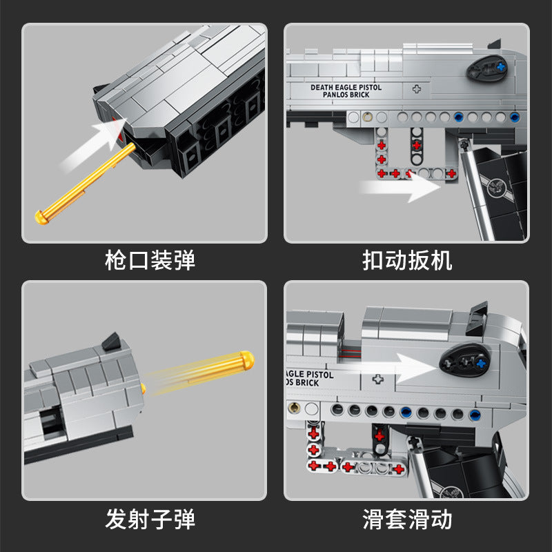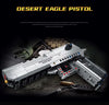 Assemble the Death Eagle Pistol — a detailed brick-built replica designed for display and collectors. This 360-piece model emphasizes styling and scale for shelf presentation rather than function.